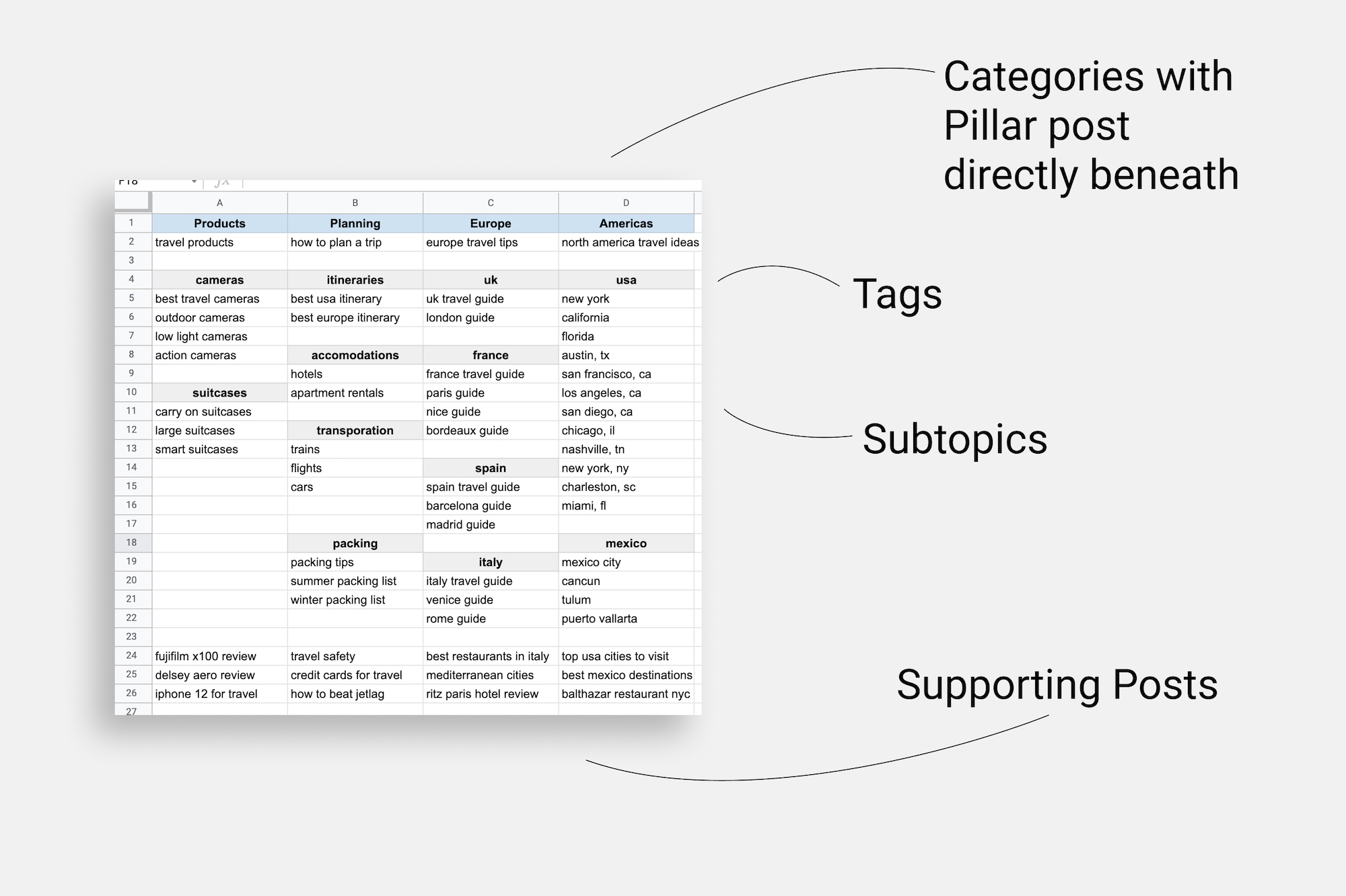 Let’s use a travel blog as an example. In this spreadsheet, you’ll see my blog categories on row 1, and their corresponding pillar posts in row 2: